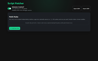 Script Patcher เป็นส่วนเสริม Chrome ฟรีที่ออกแบบมาสำหรับผู้ใช้ที่ต้องการปรับเปลี่ยนไฟล์ JavaScript อย่างง่ายดาย มันช่วยให้ผู้ใช้สามารถใช้แพตช์ที่กำหนดเองกับไฟล์ JavaScript ที่ตรงกันโดยใช้กฎที่ผู้ใช้กำหนด ซึ่งช่วยเพิ่มฟังก์ชันการทำงานของแอปพลิเคชันเว็บและเบราว์เซอร์ เครื่องมือนี้ทำงานภายในสภาพแวดล้อมที่ปลอดภัย ทำให้มั่นใจได้ว่าการปรับเปลี่ยนจะถูกจำกัดและไม่รบกวนระบบหรือประสิทธิภาพของเบราว์เซอร์โดยรวม